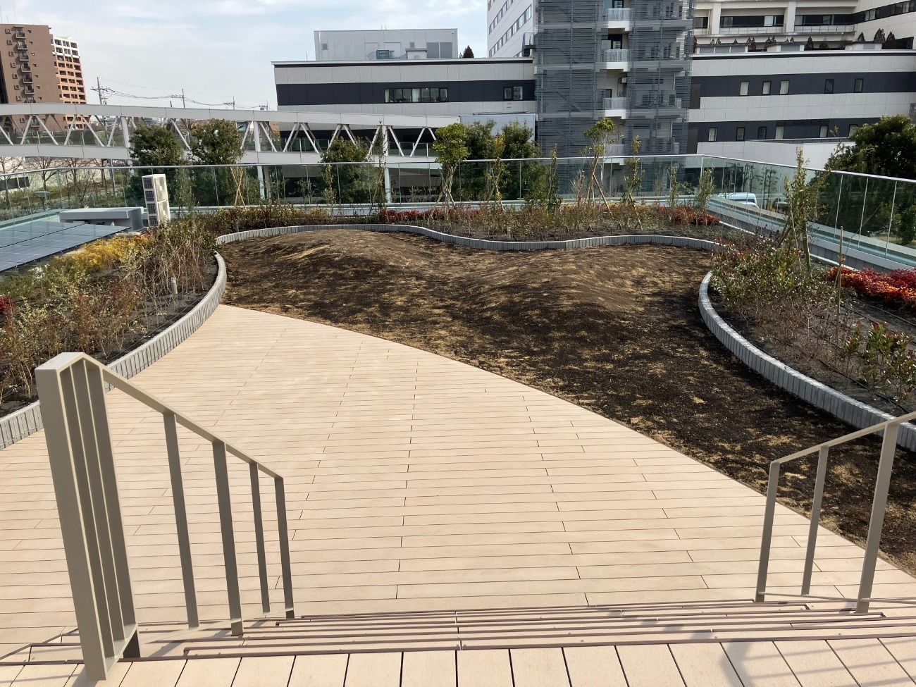 Works 某福祉施設 草花・樹木 二重床 新築 庭園型 教育文化施設 保護コンクリート 施工時期 2025年2月 所在地 東京都立川市 施工面積 578㎡ 仕様 FD-LP、FDウッド、FDパネル、ガーデングラス 樹木・菜園仕様FD-LP ウッドデッキFDウッド 人工芝ガーデングラス